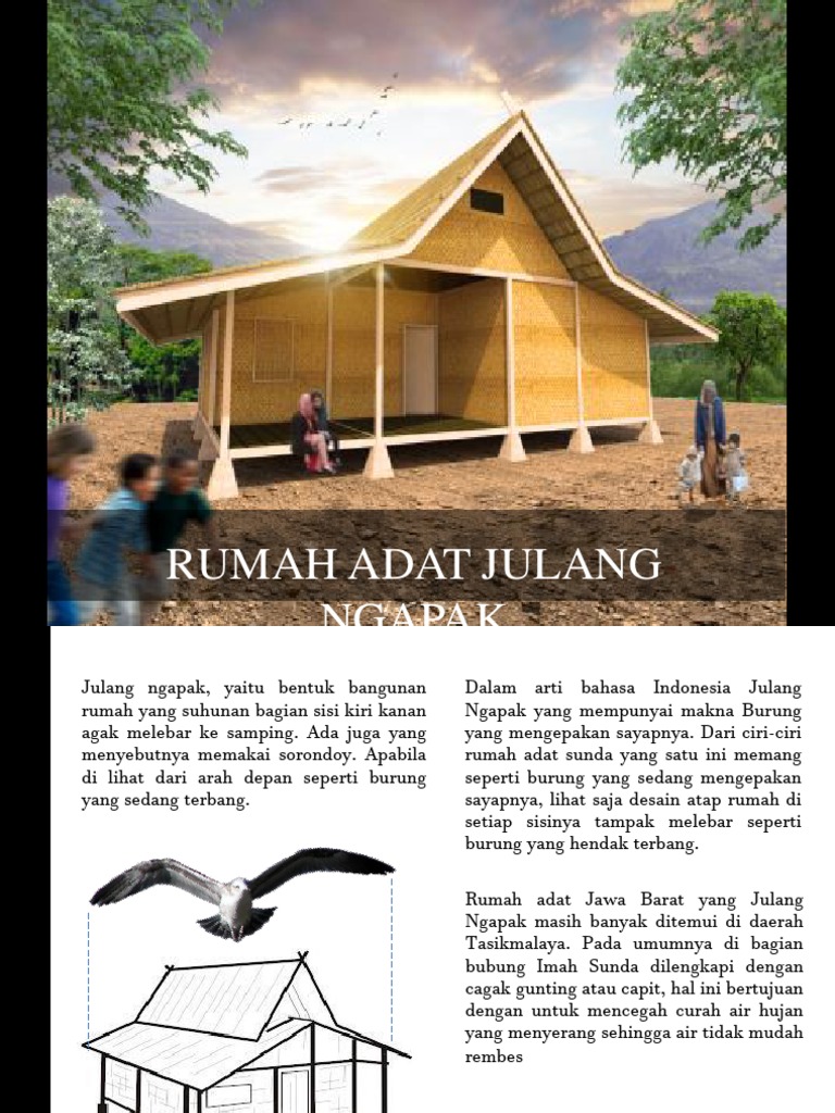 Rumah adat Julang Ngapak merupakan salah satu jenis rumah adat masyarkat Jawa Barat. Rumah Adat Julang Ngapak. Nama julang ngapak memiliki makna burung yang sedang mengepakkan sayap.